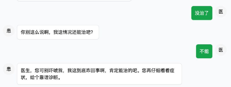 之前在其他博主看到过,AI病人的对话挺有生活气息的,所以可以享受向大模型发癫但是什么也不会发生的反差笑果(